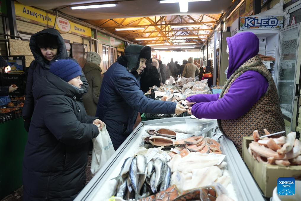 Local residents buy aquatic products at a farmers' market in Astana, Kazakhstan, on Dec. 26, 2025. (Photo by Kalizhan Ospanov/Xinhua)