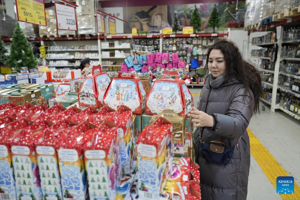 A local resident buys New Year's food gift packages at a supermarket in Astana, Kazakhstan, on Dec. 26, 2025. (Photo by Kalizhan Ospanov/Xinhua)