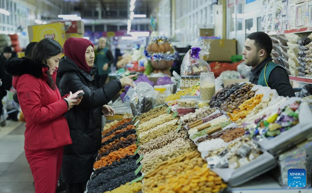 Local residents buy dried fruits at a farmers' market in Astana, Kazakhstan, on Dec. 26, 2025. (Photo by Kalizhan Ospanov/Xinhua)