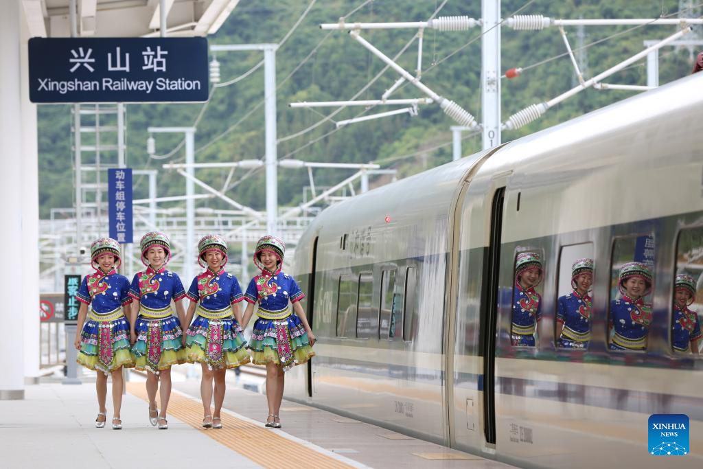 Train attendants dressed in performance costumes prepare for performances for passengers at Xingshan Station of the Zhengzhou-Chongqing high-speed railway in Yichang City, central China's Hubei Province, June 20, 2022. The Zhengzhou-Chongqing high-speed railway opened to traffic on the same day. China, home to the world's largest high-speed rail network, has expanded its total operational mileage beyond 50,000 kilometers with the launch of a new high-speed line.