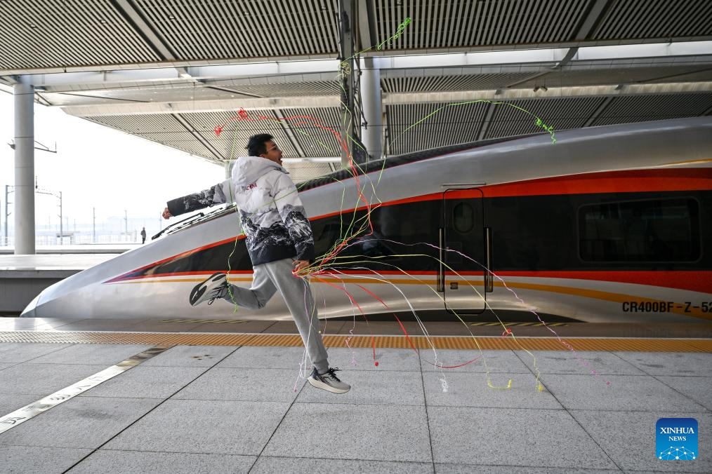 A passenger celebrates in front of C9312, the first train of the Xi'an-Yan'an high-speed railway, at Xi'an North Railway Station in northwest China's Shaanxi Province, on Dec. 26, 2025. A sleek silver bullet train departed Yan'an in northwest China's Shaanxi Province on Friday, linking the sacred revolutionary heartland to the country's rapidly expanding high-speed rail network.
