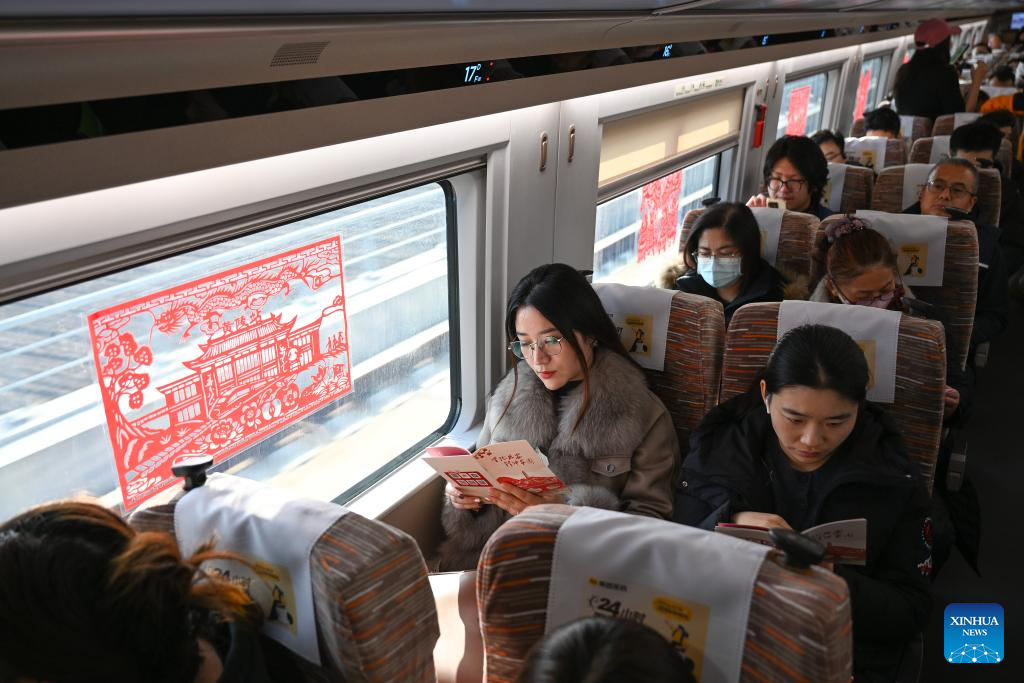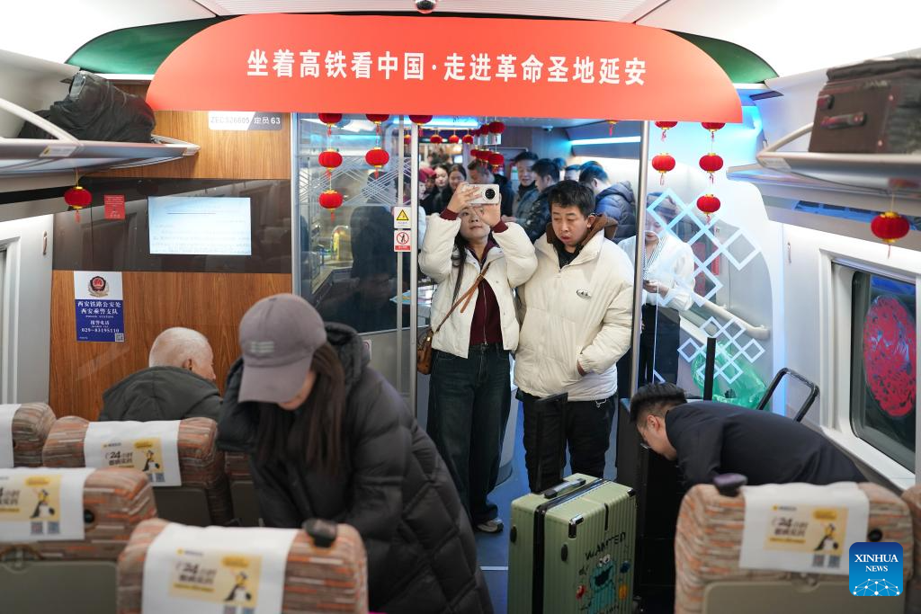 Passengers read brochures about Yan'an culture on the C9312 bullet train of the Xi'an-Yan'an high-speed railway in northwest China's Shaanxi Province, on Dec. 26, 2025. A sleek silver bullet train departed Yan'an in northwest China's Shaanxi Province on Friday, linking the sacred revolutionary heartland to the country's rapidly expanding high-speed rail network.