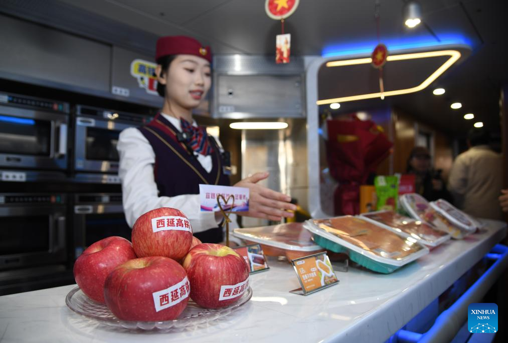A train attendant introduces specialities of Yan'an on the first train of the Xi'an-Yan'an high-speed railway in northwest China's Shaanxi Province, Dec. 26, 2025. A sleek silver bullet train departed Yan'an in northwest China's Shaanxi Province on Friday, linking the sacred revolutionary heartland to the country's rapidly expanding high-speed rail network.