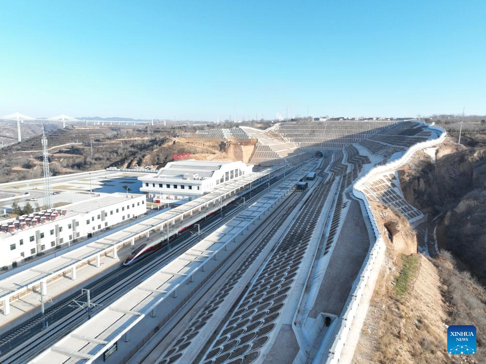 An aerial drone photo taken on Dec. 26, 2025 shows C9309, the first train of the Xi'an-Yan'an high-speed railway bound for Xi'an, approaching Fuping South Railway Station in northwest China's Shaanxi Province. A sleek silver bullet train departed Yan'an in northwest China's Shaanxi Province on Friday, linking the sacred revolutionary heartland to the country's rapidly expanding high-speed rail network.