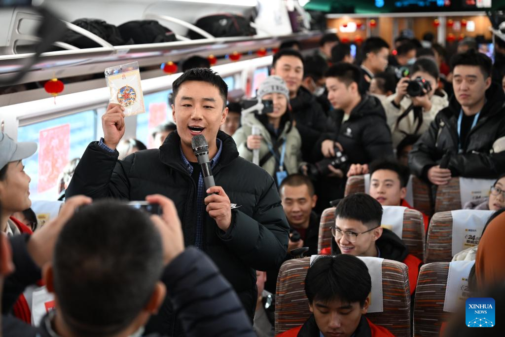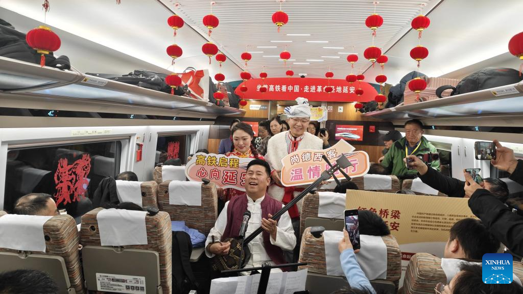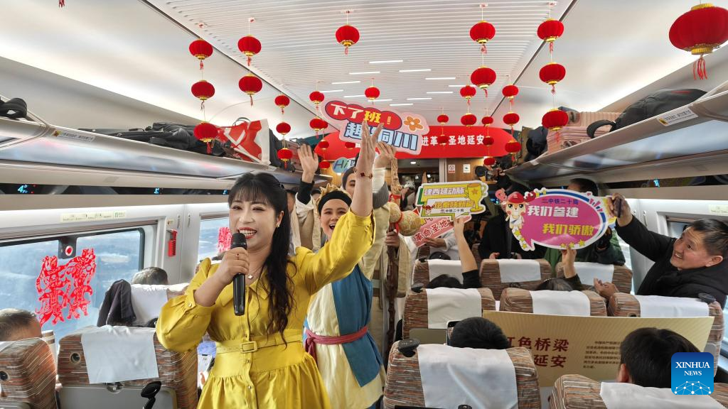 People perform on the first train of the Xi'an-Yan'an high-speed railway in northwest China's Shaanxi Province, Dec. 26, 2025. A sleek silver bullet train departed Yan'an in northwest China's Shaanxi Province on Friday, linking the sacred revolutionary heartland to the country's rapidly expanding high-speed rail network.