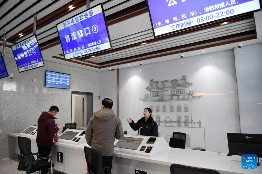 Passengers buy tickets at Fuping South Railway Station along the Xi'an-Yan'an high-speed railway in northwest China's Shaanxi Province, on Dec. 26, 2025. A sleek silver bullet train departed Yan'an in northwest China's Shaanxi Province on Friday, linking the sacred revolutionary heartland to the country's rapidly expanding high-speed rail network.