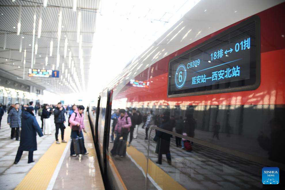Passengers board C9312, the first train of the Xi'an-Yan'an high-speed railway bound for Yan'an, in northwest China's Shaanxi Province, Dec. 26, 2025. A sleek silver bullet train departed Yan'an in northwest China's Shaanxi Province on Friday, linking the sacred revolutionary heartland to the country's rapidly expanding high-speed rail network.