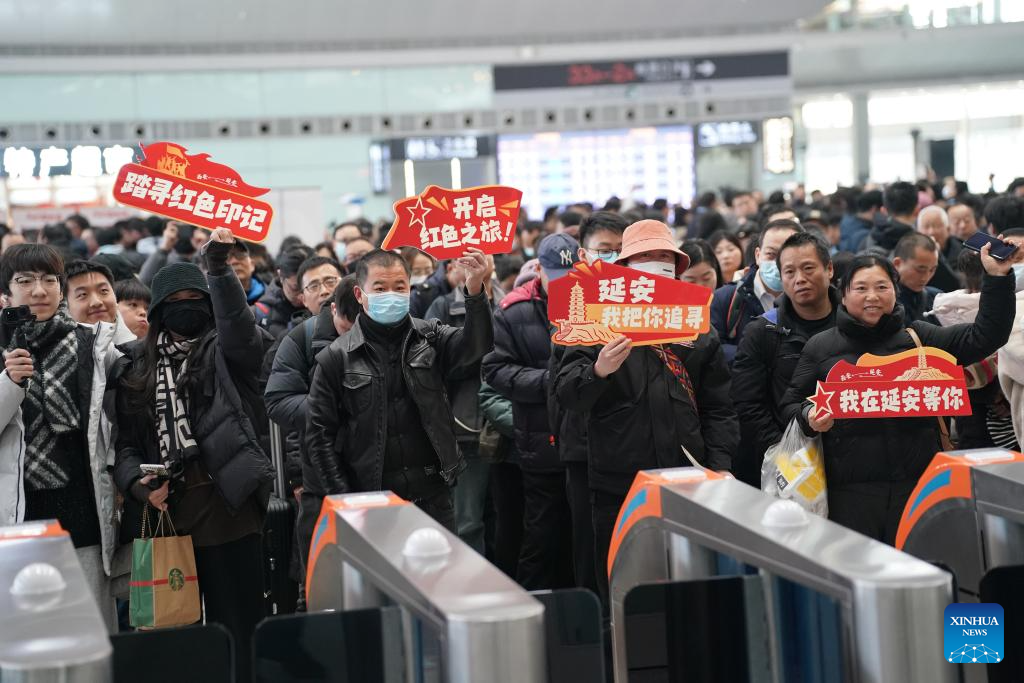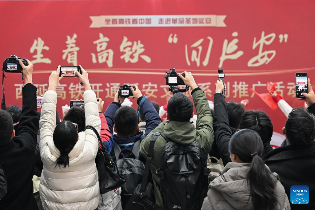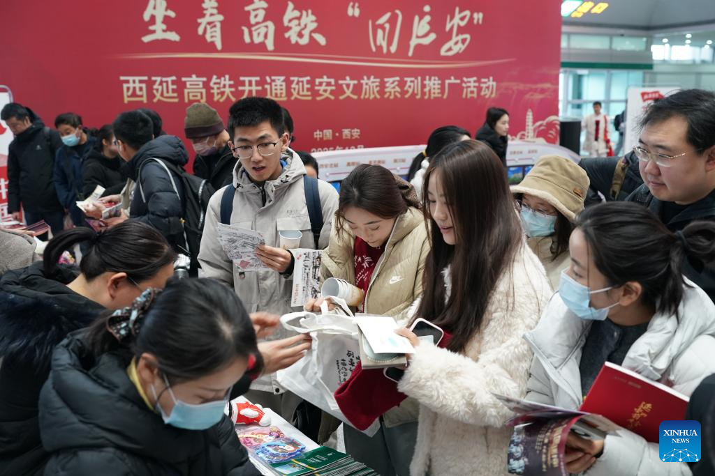 Passengers attend a promotional event marking the operation of Xi'an-Yan'an high-speed railway at Xi'an North Railway Station in Xi'an, northwest China's Shaanxi Province, Dec. 26, 2025. A sleek silver bullet train departed Yan'an in northwest China's Shaanxi Province on Friday, linking the sacred revolutionary heartland to the country's rapidly expanding high-speed rail network.