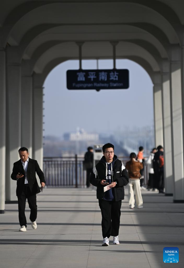 Passengers arrived are pictured at Fuping South Railway Station along the Xi'an-Yan'an high-speed railway in northwest China's Shaanxi Province, on Dec. 26, 2025. A sleek silver bullet train departed Yan'an in northwest China's Shaanxi Province on Friday, linking the sacred revolutionary heartland to the country's rapidly expanding high-speed rail network.