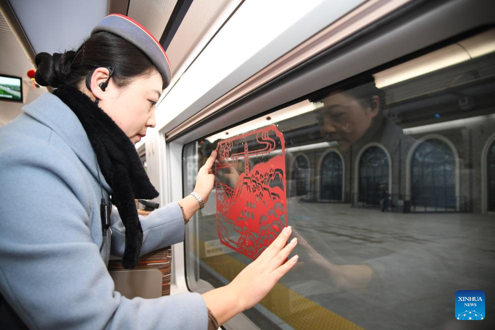 A train attendant pastes a paper-cut window decoration on the first train of the Xi'an-Yan'an high-speed railway at Yan'an Station in Yan'an, northwest China's Shaanxi Province, Dec. 26, 2025. A sleek silver bullet train departed Yan'an in northwest China's Shaanxi Province on Friday, linking the sacred revolutionary heartland to the country's rapidly expanding high-speed rail network.