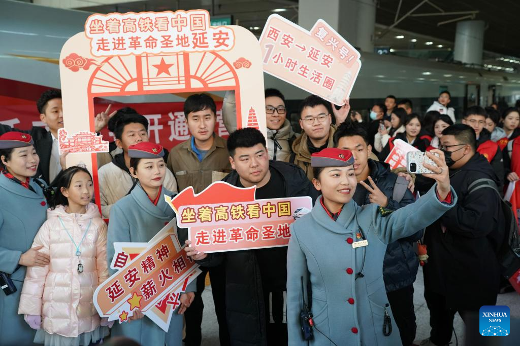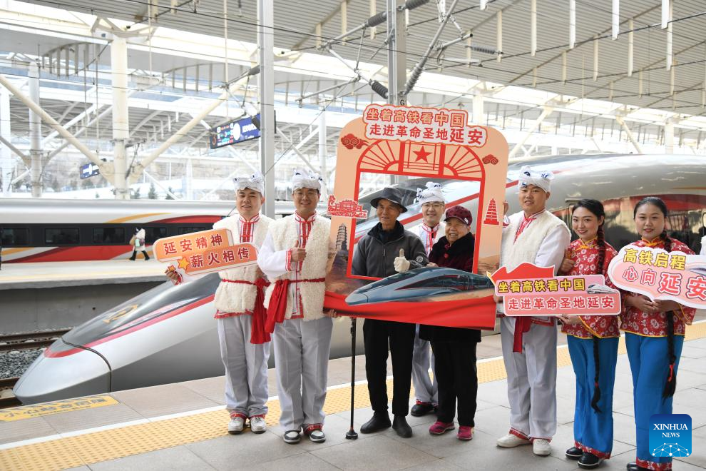 Passengers taking the first train of the Xi'an-Yan'an high-speed railway pose for photos with performers at Yan'an Station in Yan'an, northwest China's Shaanxi Province, Dec. 26, 2025. A sleek silver bullet train departed Yan'an in northwest China's Shaanxi Province on Friday, linking the sacred revolutionary heartland to the country's rapidly expanding high-speed rail network.