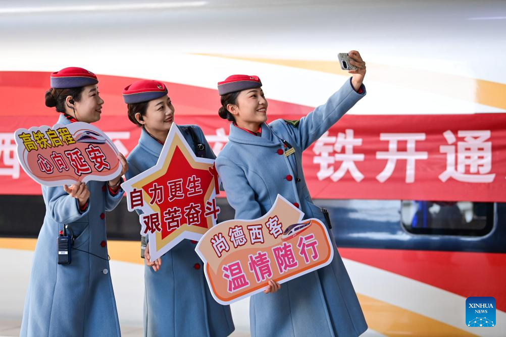 Train attendants take selfies in front of the first train of the Xi'an-Yan'an high-speed railway in northwest China's Shaanxi Province, Dec. 26, 2025. A sleek silver bullet train departed Yan'an in northwest China's Shaanxi Province on Friday, linking the sacred revolutionary heartland to the country's rapidly expanding high-speed rail network.