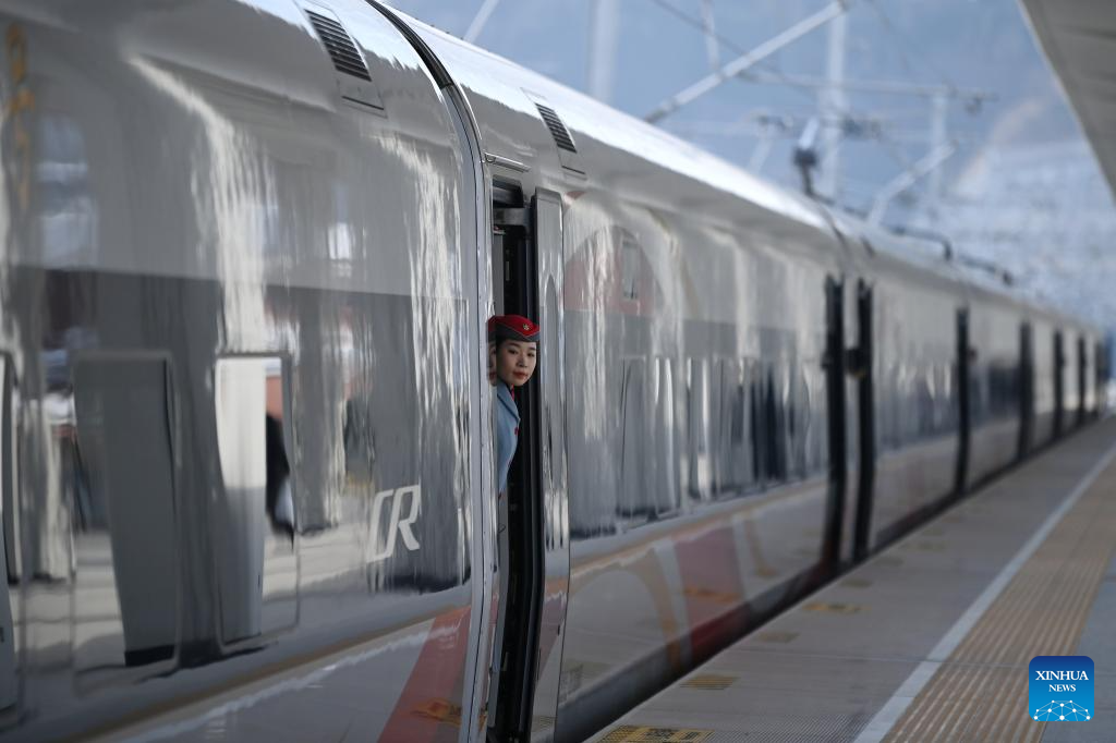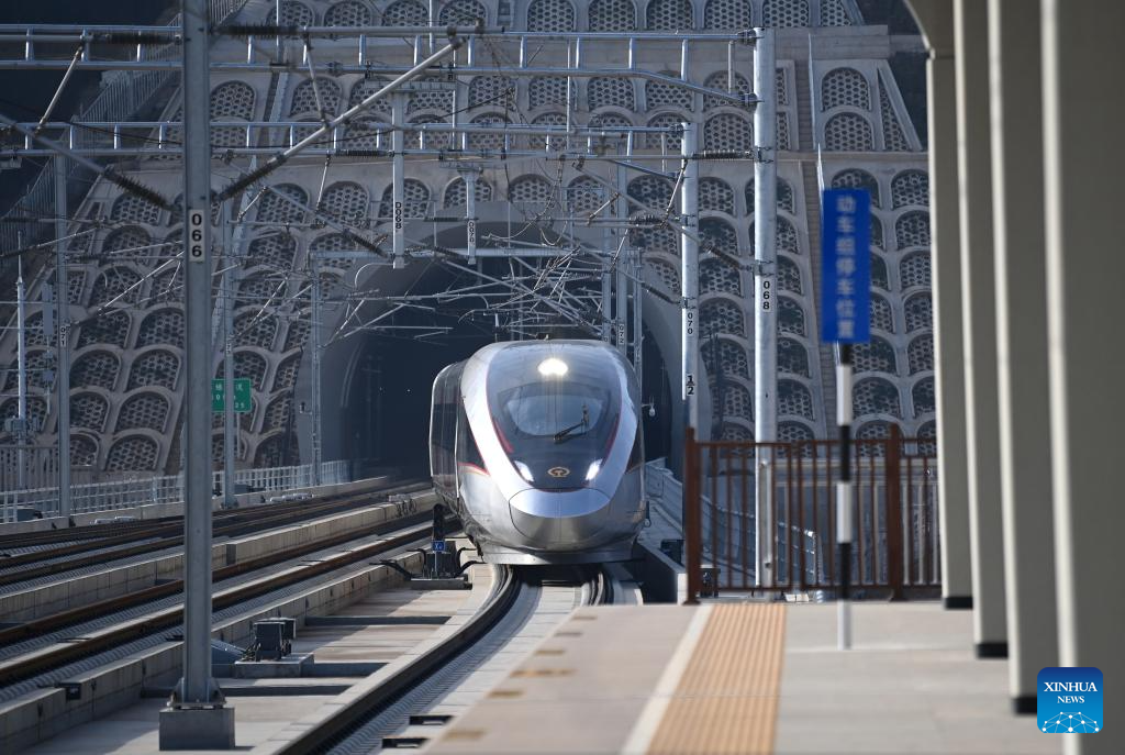 A "Fuxing" bullet train is pictured at Yan'an Station of the new Xi'an-Yan'an high-speed railway in northwest China's Shaanxi Province, on Dec. 26, 2025. (Xinhua/Zhang Bowen)