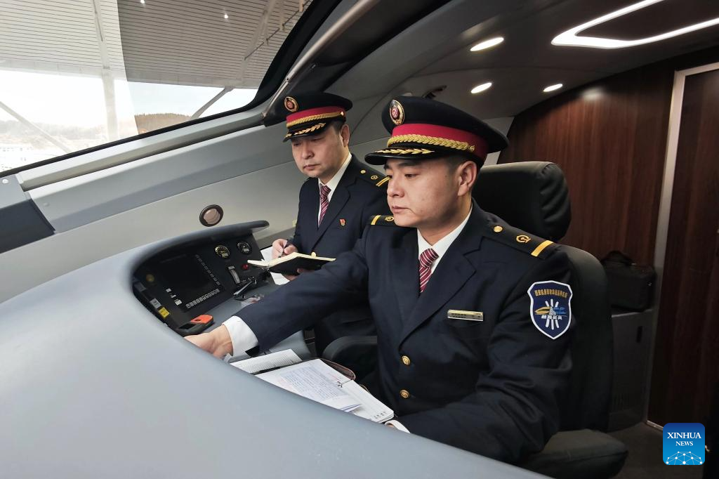 Drivers of the first train of the Xi'an-Yan'an high-speed railway make preparations at Yan'an Station in Yan'an, northwest China's Shaanxi Province, Dec. 26, 2025. A sleek silver bullet train departed Yan'an in northwest China's Shaanxi Province on Friday, linking the sacred revolutionary heartland to the country's rapidly expanding high-speed rail network.