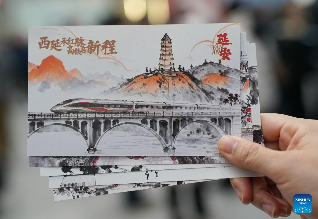 A passenger shows postcards marking the start of operation of the Xi'an-Yan'an high-speed railway at Xi'an North Railway Station in Xi'an, northwest China's Shaanxi Province, Dec. 26, 2025. A sleek silver bullet train departed Yan'an in northwest China's Shaanxi Province on Friday, linking the sacred revolutionary heartland to the country's rapidly expanding high-speed rail network.
