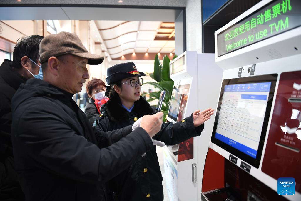 A staff member guides passengers to use a ticket vending machine at Fuping South Railway Station along the Xi'an-Yan'an high-speed railway in northwest China's Shaanxi Province, on Dec. 26, 2025. A sleek silver bullet train departed Yan'an in northwest China's Shaanxi Province on Friday, linking the sacred revolutionary heartland to the country's rapidly expanding high-speed rail network.