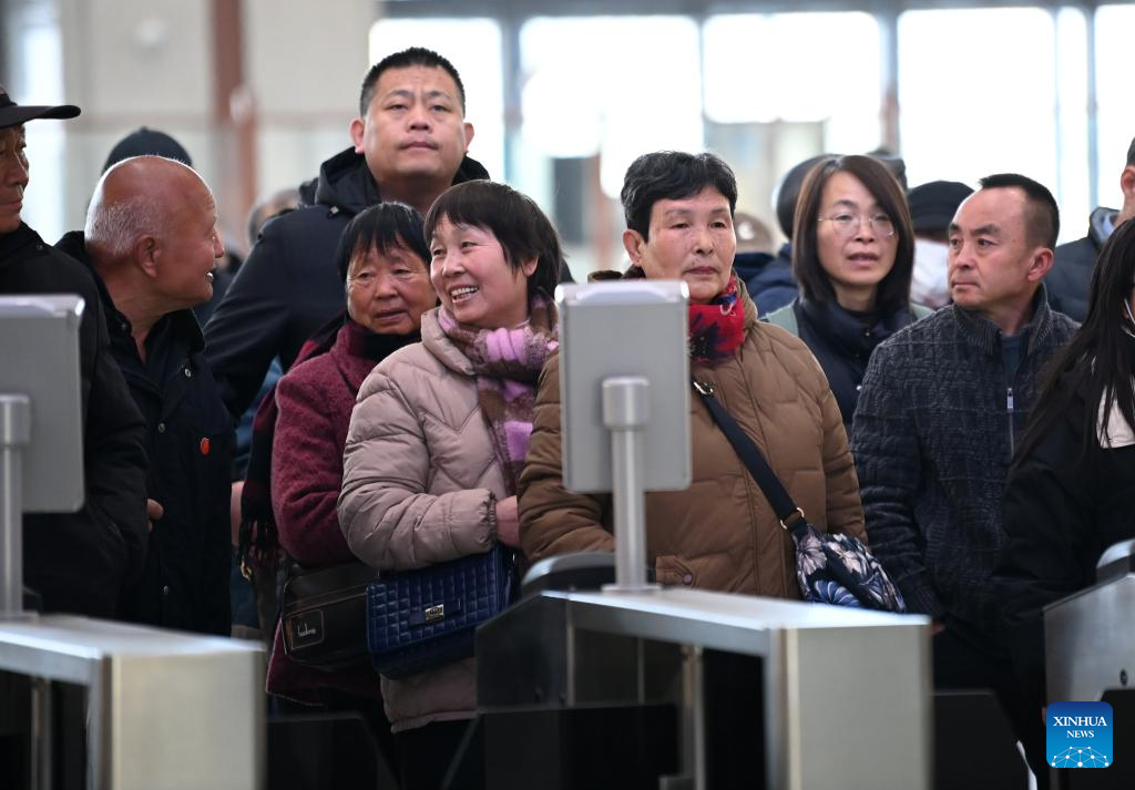 Passengers line up for ticket check at Fuping South Railway Station along the Xi'an-Yan'an high-speed railway in northwest China's Shaanxi Province, on Dec. 26, 2025. A sleek silver bullet train departed Yan'an in northwest China's Shaanxi Province on Friday, linking the sacred revolutionary heartland to the country's rapidly expanding high-speed rail network.