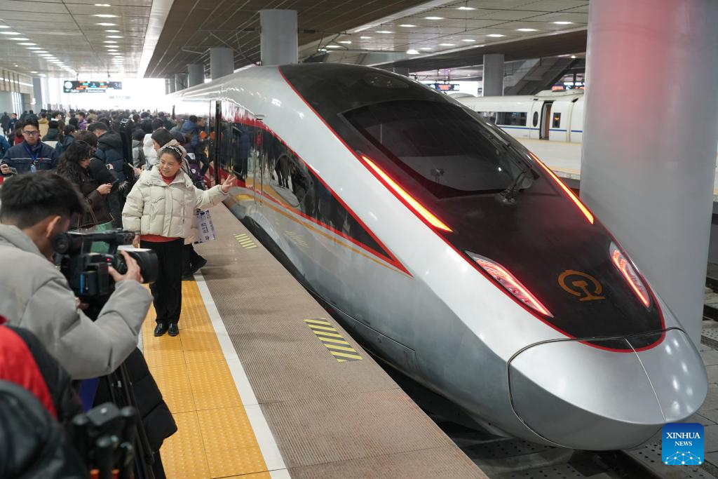 A passenger poses for photos in front of the first train of the Xi'an-Yan'an high-speed railway bound for Yan'an at Xi'an North Railway Station in Xi'an, northwest China's Shaanxi Province, Dec. 26, 2025. A sleek silver bullet train departed Yan'an in northwest China's Shaanxi Province on Friday, linking the sacred revolutionary heartland to the country's rapidly expanding high-speed rail network.