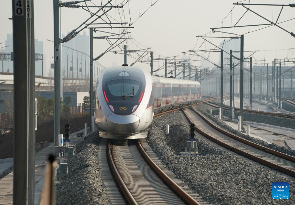 C9312, the first train of the Xi'an-Yan'an high-speed railway, is pictured at Fuping South Railway Station in northwest China's Shaanxi Province, on Dec. 26, 2025. A sleek silver bullet train departed Yan'an in northwest China's Shaanxi Province on Friday, linking the sacred revolutionary heartland to the country's rapidly expanding high-speed rail network.