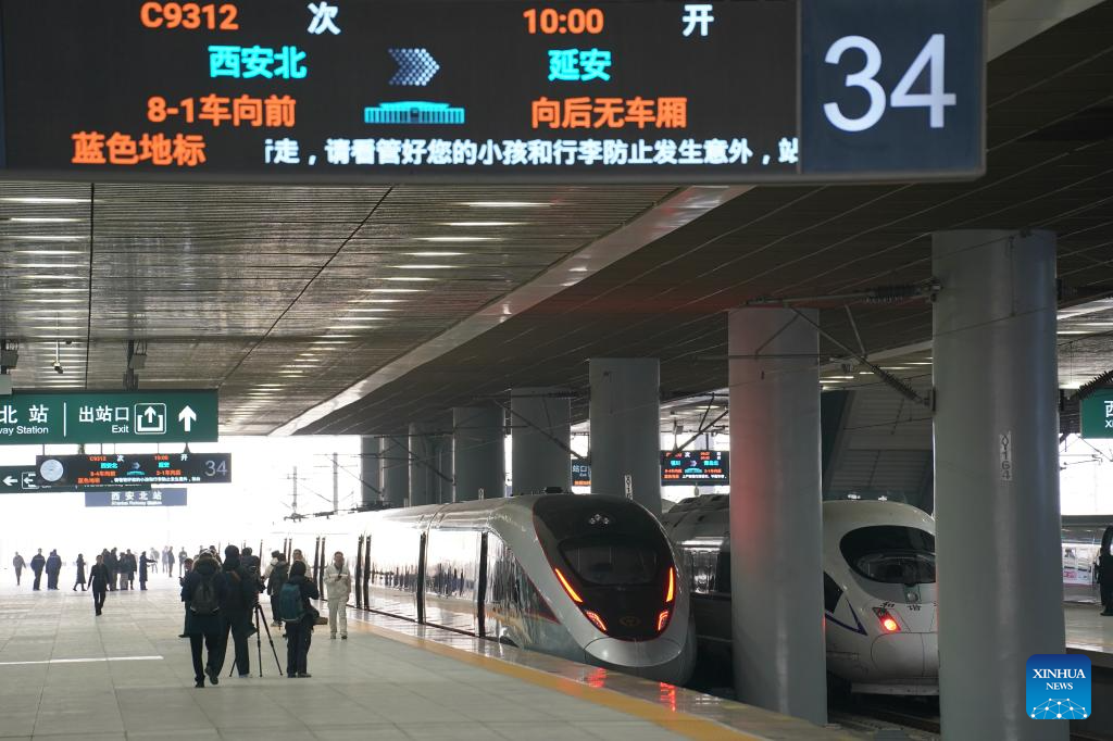This photo taken on Dec. 26, 2025 shows C9312, the first train of the Xi'an-Yan'an high-speed railway bound for Yan'an, at Xi'an North Railway Station in Xi'an, northwest China's Shaanxi Province. A sleek silver bullet train departed Yan'an in northwest China's Shaanxi Province on Friday, linking the sacred revolutionary heartland to the country's rapidly expanding high-speed rail network.