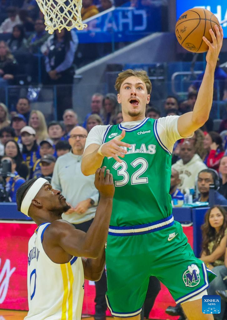 Cooper Flagg (front R) of Dallas Mavericks breaks through during the 2025-2026 NBA regular season game between Golden State Warriors and Dallas Mavericks in San Francisco, the United States, Dec. 25, 2025. (Photo by Arthur Dong/Xinhua)