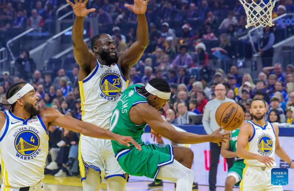 Draymond Green (R) and Moses Moody (L) of Golden State Warriors defend Brandon Williams of Dallas Mavericks during the 2025-2026 NBA regular season game between Golden State Warriors and Dallas Mavericks in San Francisco, the United States, Dec. 25, 2025. (Photo by Arthur Dong/Xinhua)