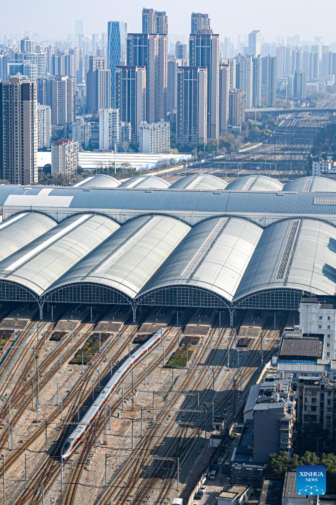 An aerial drone photo taken on Dec. 26, 2025 shows a bullet train pulling into the Yichang North Railway Station in Yichang, central China's Hubei Province. The Wuhan-Yichang section of a high-speed railway linking east China's Shanghai, southwest China's Chongqing and Chengdu of southwest China's Sichuan Province was officially put into operation on Friday.