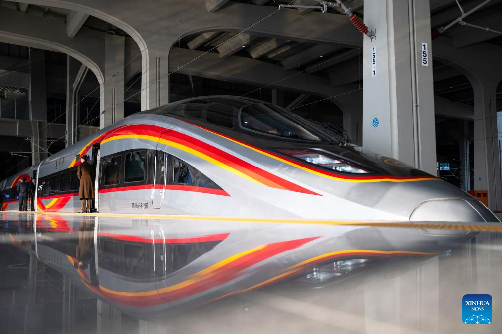 A bullet train parks at the Yichang North Railway Station in Yichang, central China's Hubei Province, Dec. 26, 2025. The Wuhan-Yichang section of a high-speed railway linking east China's Shanghai, southwest China's Chongqing and Chengdu of southwest China's Sichuan Province was officially put into operation on Friday.