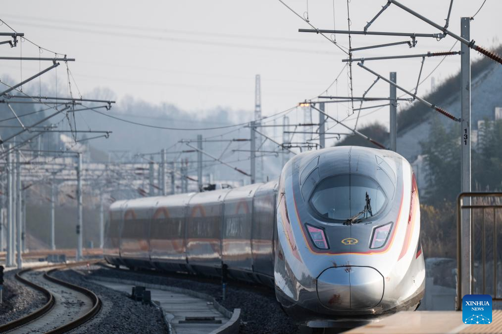 A bullet train leaves the Yichang North Railway Station in Yichang, central China's Hubei Province, Dec. 26, 2025. The Wuhan-Yichang section of a high-speed railway linking east China's Shanghai, southwest China's Chongqing and Chengdu of southwest China's Sichuan Province was officially put into operation on Friday.