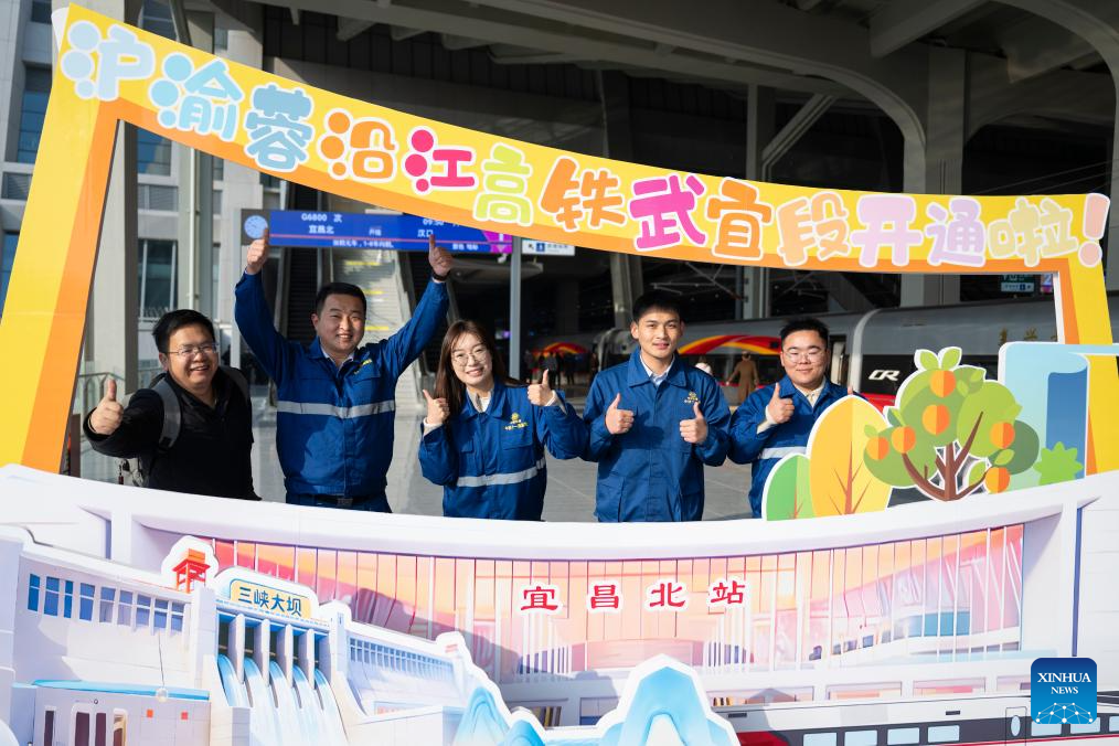 Railway constructors pose for a group photo on the platform of the Yichang North Railway Station in Yichang, central China's Hubei Province, Dec. 26, 2025. The Wuhan-Yichang section of a high-speed railway linking east China's Shanghai, southwest China's Chongqing and Chengdu of southwest China's Sichuan Province was officially put into operation on Friday.