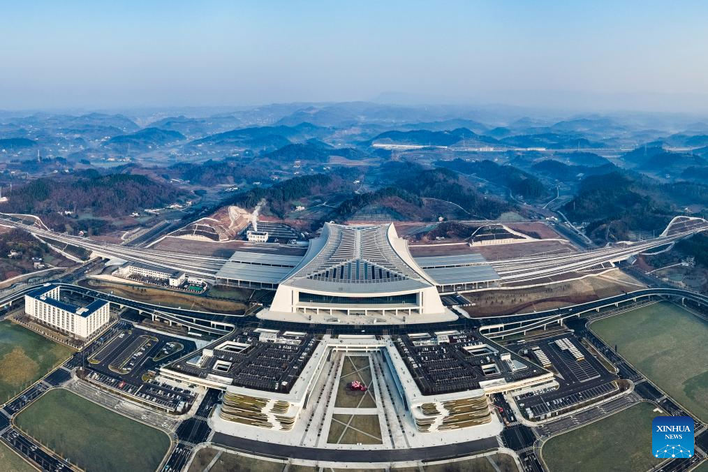 An aerial drone photo taken on Dec. 26, 2025 shows a view of the Yichang North Railway Station in Yichang, central China's Hubei Province. The Wuhan-Yichang section of a high-speed railway linking east China's Shanghai, southwest China's Chongqing and Chengdu of southwest China's Sichuan Province was officially put into operation on Friday.