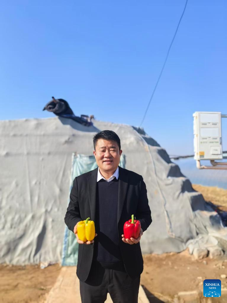 Shang Jinhua, general manager of Ningxia Zhonghui Agricultural Technology Co., Ltd., displays bell peppers at a plantation in Fengzhuang Village, Zhongwei City, northwest China's Ningxia Hui Autonomous Region, Nov. 27, 2025. TO GO WITH "Across China: China's fresh produce finds favor in Central Asian market" (Xinhua)