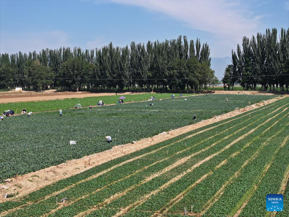 A plantation for cold-climate vegetables is pictured in Changxin Township of Helan County, Yinchuan City, northwest China's Ningxia Hui Autonomous Region, July 4, 2024. TO GO WITH "Across China: China's fresh produce finds favor in Central Asian market" (Xinhua/Liu Hai)