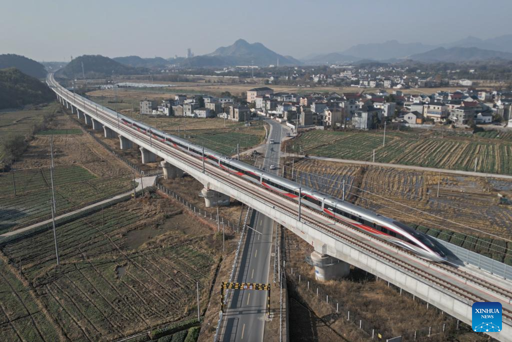 An aerial drone photo taken on Dec. 26, 2025 shows the C3132 passenger train bound for Hangzhou running along the Hangzhou-Quzhou high-speed railway in east China's Zhejiang Province. The 131-km high-speed railway connecting the cities of Hangzhou and Quzhou in Zhejiang was put into operation on Friday. (Xinhua/Huang Zongzhi)