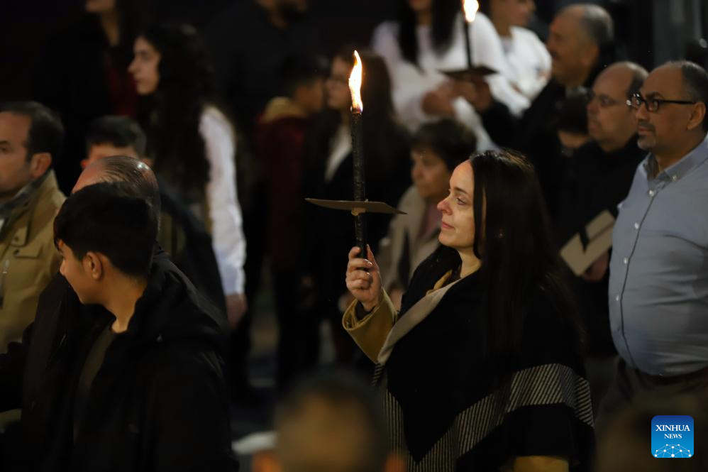 Palestinians participate in a march in the city of Bethlehem, south of the West Bank, to express solidarity with the victims in Gaza and call for an end to the war, on Dec. 25, 2025. (Photo by Mamoun Wazwaz/Xinhua)