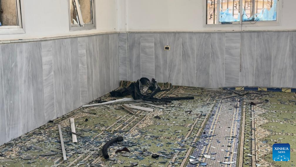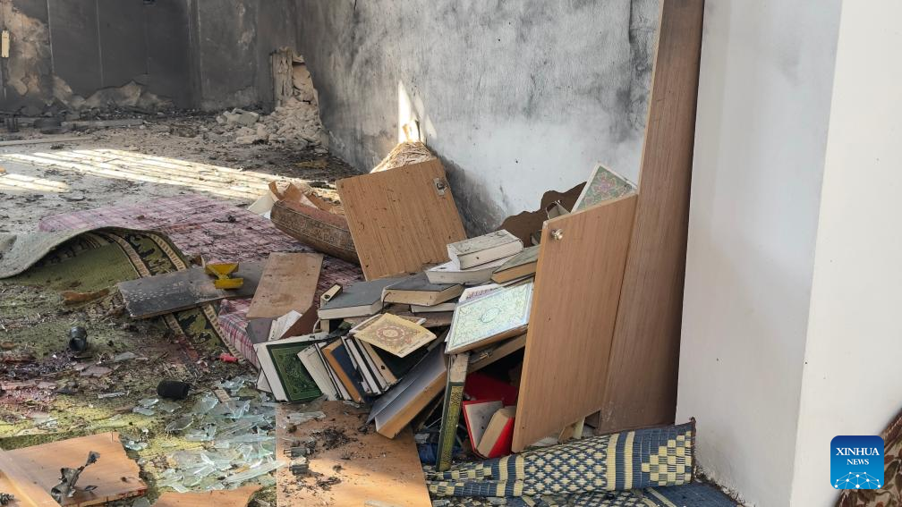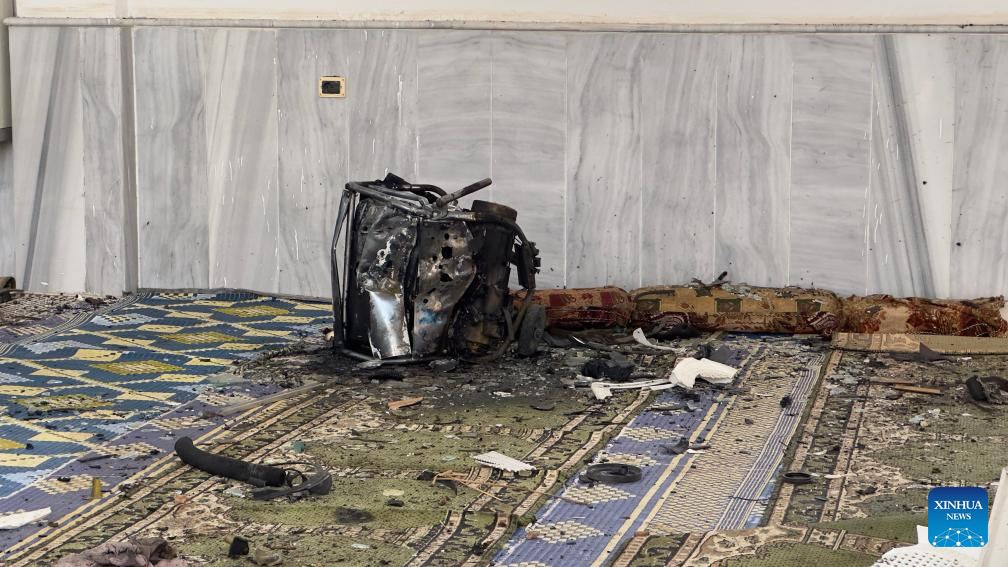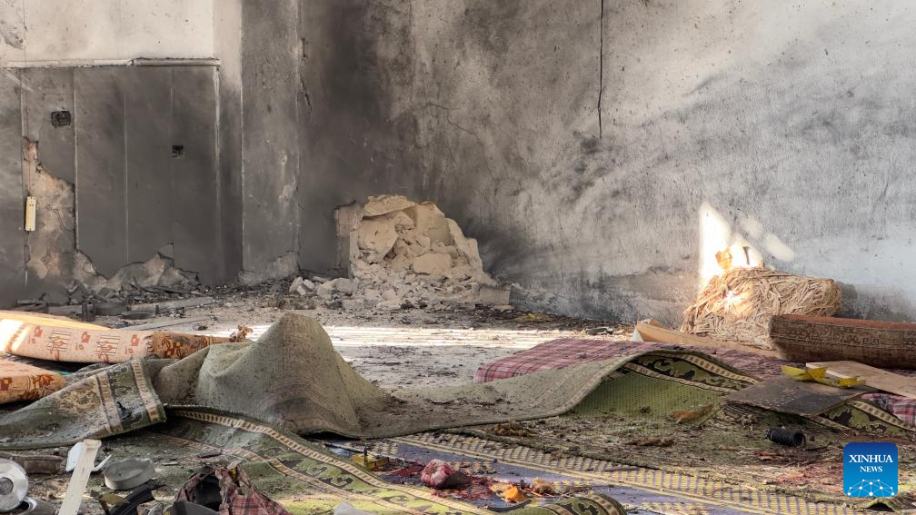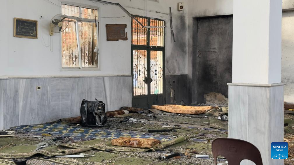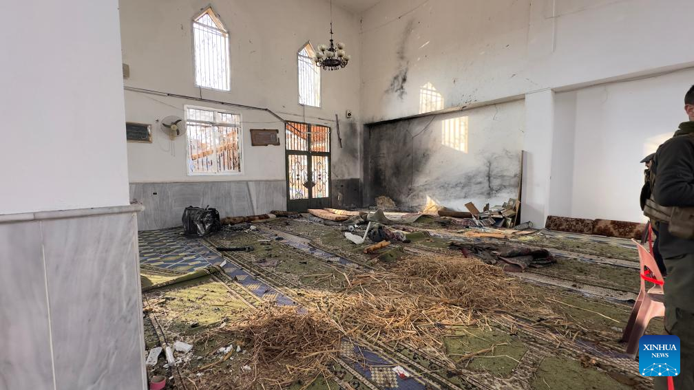 This photo taken on Dec. 26, 2025 shows a view inside a mosque after an explosion in the Wadi al-Dhahab neighborhood of Homs, central Syria, on Dec. 26, 2025. (Str/Xinhua)