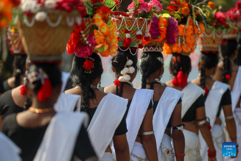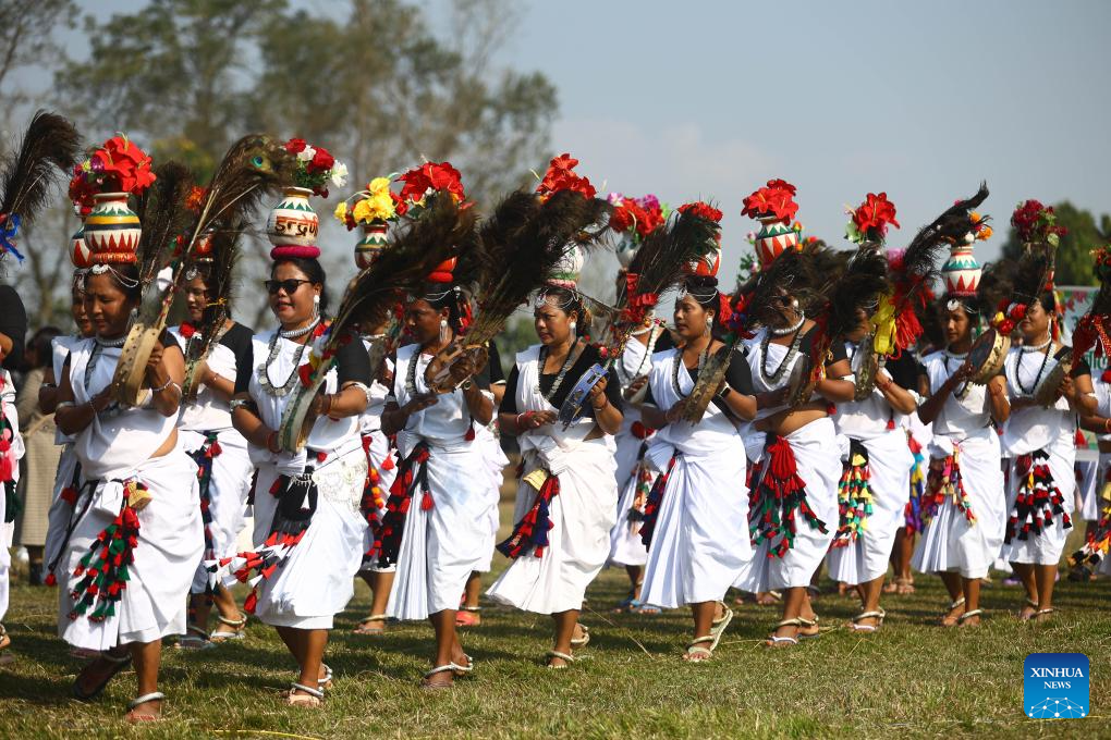 Nepalese women dressed in traditional attire participate in a rally during the 19th Elephant and Tourism Festival in Chitwan, Nepal, Dec. 26, 2025. The event aims to bring human closer with elephants, encourage wildlife protection and conservation, and promote tourism in the region. (Photo by Sulav Shrestha/Xinhua)