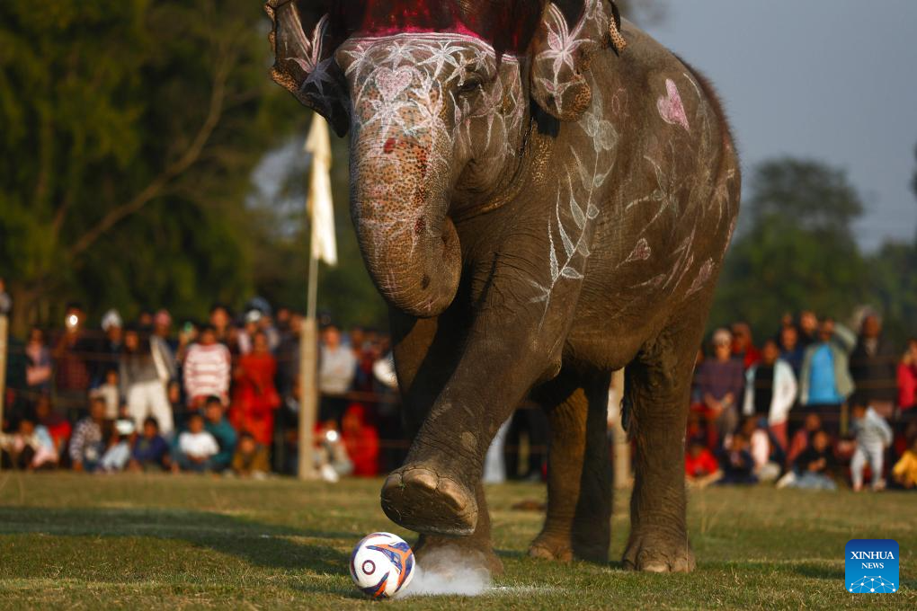 An elephant shoots a ball during a football game at the 19th Elephant and Tourism Festival in Chitwan, Nepal, Dec. 26, 2025. The event aims to bring human closer with elephants, encourage wildlife protection and conservation, and promote tourism in the region. (Photo by Sulav Shrestha/Xinhua)