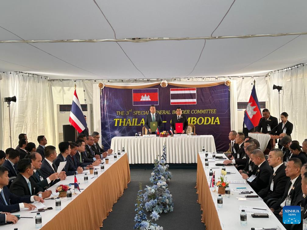 CHANTHABURI, Thailand, Dec. 27 (Xinhua) -- Thai Defense Minister Natthapon Nakpanich and Cambodian Deputy Prime Minister and Defense Minister Tea Seiha on Saturday signed an agreement on ceasefire at a border checkpoint in Thailand's Chanthaburi Province. ■