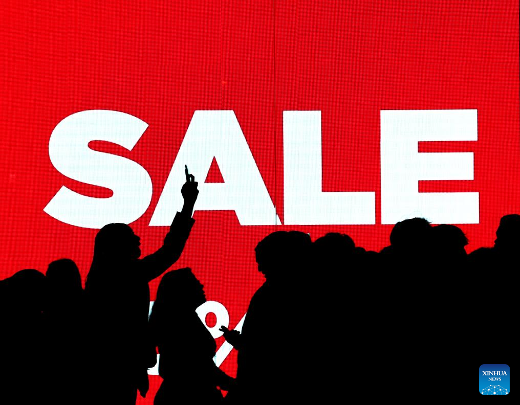 People walk past a sale sign on Oxford Street during Boxing Day sales in London, Britain, on Dec. 26, 2025. (Xinhua/Li Ying)