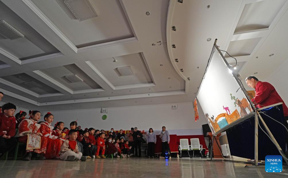 Children watch a shadow puppet show at a kindergarten in Yinchuan, northwest China's Ningxia Hui Autonomous Region, Dec. 27, 2025. As the New Year approaches, a kindergarten in Yinchuan City held an activity and invited inheritors of intangible cultural heritage to promote lion dance, paper-cutting making and sugar painting. (Xinhua/Wang Peng)