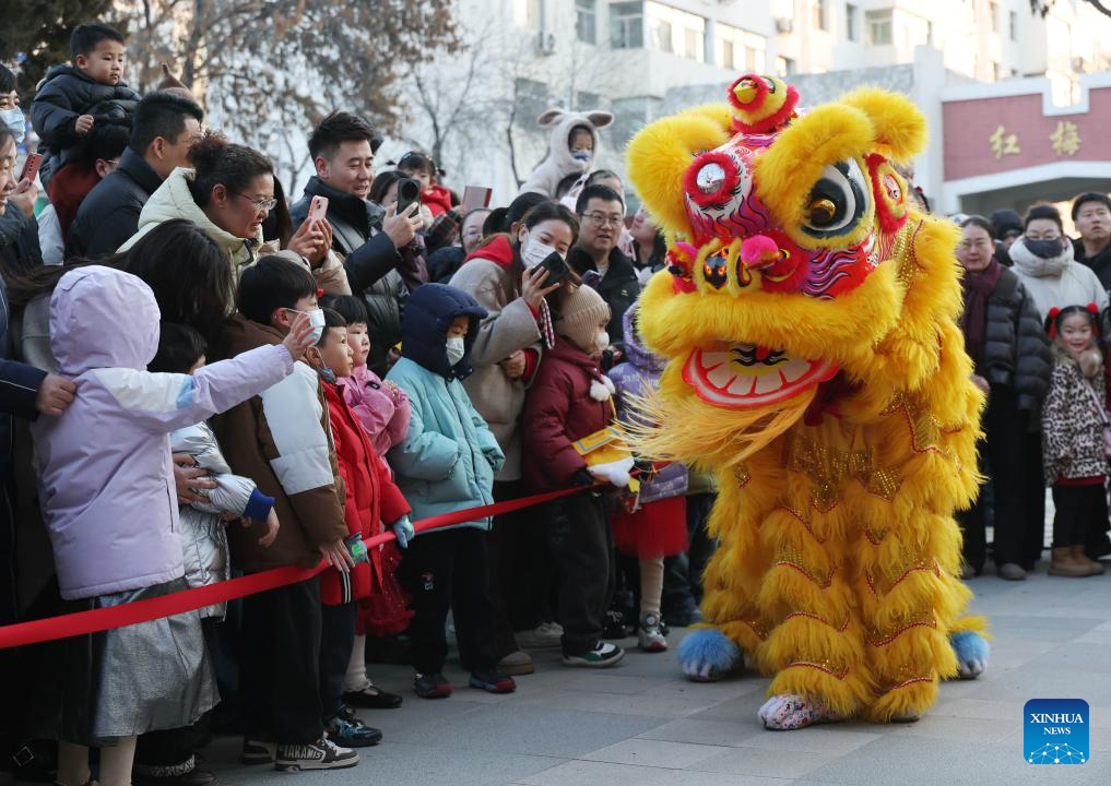 Children watch a lion dance performance at a kindergarten in Yinchuan, northwest China's Ningxia Hui Autonomous Region, Dec. 27, 2025. As the New Year approaches, a kindergarten in Yinchuan City held an activity and invited inheritors of intangible cultural heritage to promote lion dance, paper-cutting making and sugar painting. (Xinhua/Wang Peng)