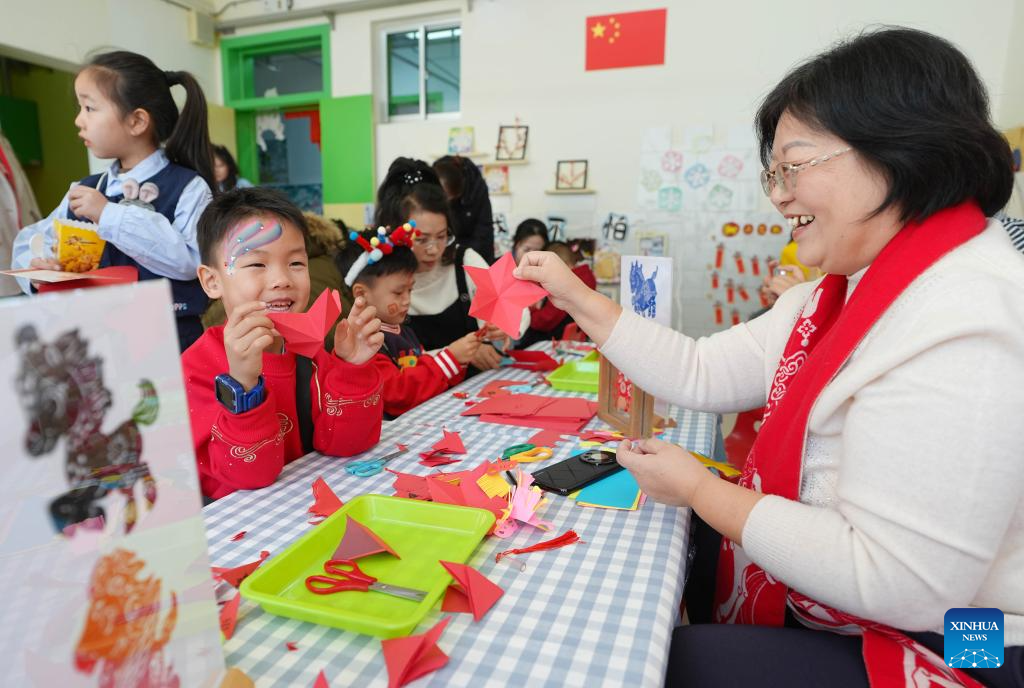Children make paper-cutting works under the guidance of a paper-cutting artist at a kindergarten in Yinchuan, northwest China's Ningxia Hui Autonomous Region, Dec. 27, 2025. As the New Year approaches, a kindergarten in Yinchuan City held an activity and invited inheritors of intangible cultural heritage to promote lion dance, paper-cutting making and sugar painting. (Xinhua/Wang Peng)