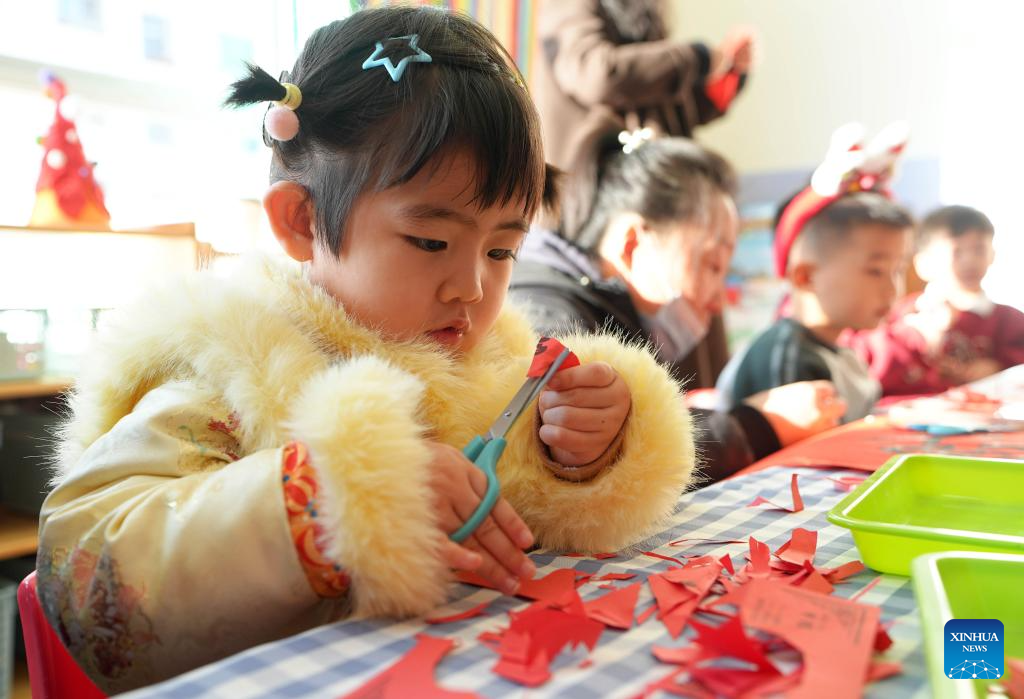 A child makes paper-cutting works under the guidance of a paper-cutting artist at a kindergarten in Yinchuan, northwest China's Ningxia Hui Autonomous Region, Dec. 27, 2025. As the New Year approaches, a kindergarten in Yinchuan City held an activity and invited inheritors of intangible cultural heritage to promote lion dance, paper-cutting making and sugar painting. (Xinhua/Wang Peng)