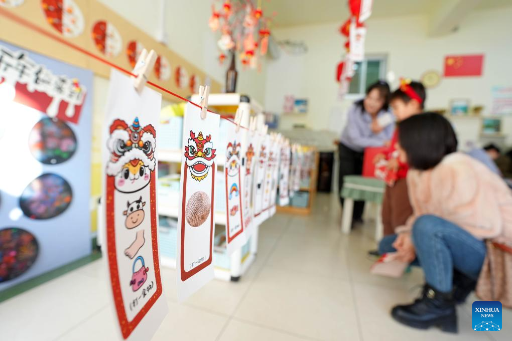 Children participate in a riddle guessing activity at a kindergarten in Yinchuan, northwest China's Ningxia Hui Autonomous Region, Dec. 27, 2025. As the New Year approaches, a kindergarten in Yinchuan City held an activity and invited inheritors of intangible cultural heritage to promote lion dance, paper-cutting making and sugar painting. (Xinhua/Wang Peng)