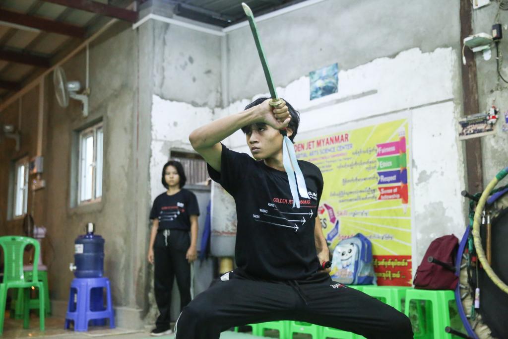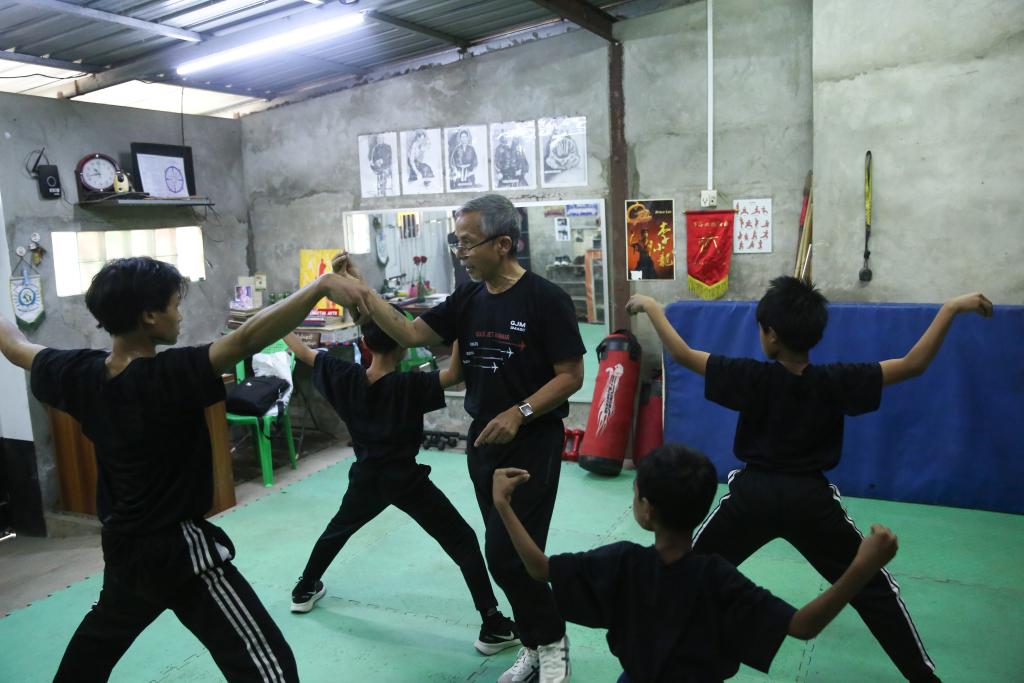 Watching closely is U Khin Maung Nyein, 66, the founder of Golden Jet Myanmar, a Chinese martial arts center in Yangon. For 46 years, he has devoted his life to teaching Chinese martial arts, inspired by the Bruce Lee films that once captivated him as a teenager.