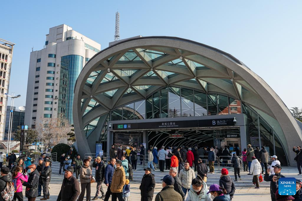 Citizens enter the Quancheng Park Station of Jinan Subway Line 4, in Jinan, east China's Shandong Province, Dec. 27, 2025. China's first subway line passing through a karst spring area began operation on Saturday in Jinan, marking an engineering breakthrough that balances urban transit demands with the protection of natural water resources.