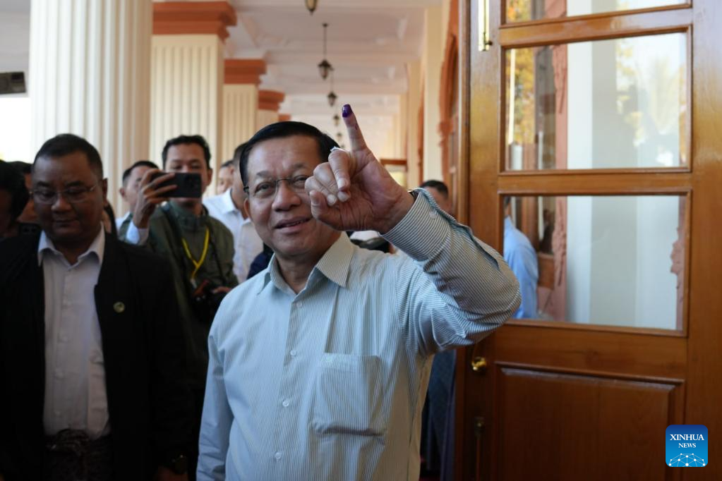 Myanmar's Acting President Min Aung Hlaing shows his inked finger after casting vote at a polling station in Nay Pyi Taw, Myanmar, Dec. 28, 2025. Myanmar kicked off its 2025 multi-party democratic general election with the first phase held on Sunday.