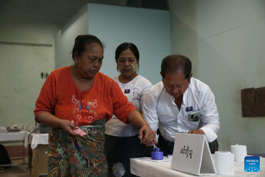 This photo taken on Dec. 28, 2025 shows a scene at a polling station in Yangon, Myanmar. Myanmar kicked off its 2025 multi-party democratic general election with the first phase held on Sunday. The general election is scheduled to be held in three phases, with the second phase set for Jan. 11, 2026, followed by the third phase on Jan. 25. (Xinhua/Myo Kyaw Soe)