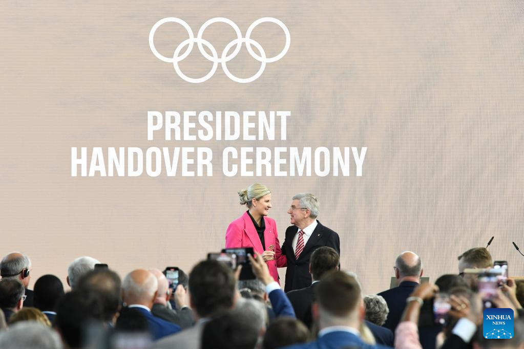 This file photo taken on June 23, 2025 shows IOC President Kirsty Coventry (L) receiving the key from outgoing IOC President Thomas Bach during a president handover ceremony at Olympic House in Lausanne, Switzerland. (Xinhua/Lian Yi)